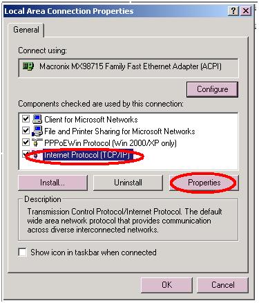Right click on Local Area Connection and then choose property. Single left click on Internet Protocol(TCP/IP) to highlight it and then single left click on Properties button.