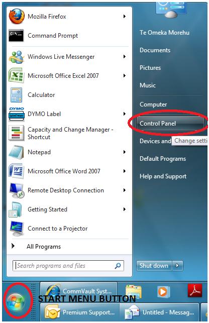 When you have turned on your windows 7 machine and it has loaded up. Please left click on the “start” button(little circle with the 4 colours in it) down the bottom left hand corner. When you left click on the “start” circle it will bring up the “start menu” as shown below. In the “start menu”, left lick on the “ Control Panel” option on the right hand side.