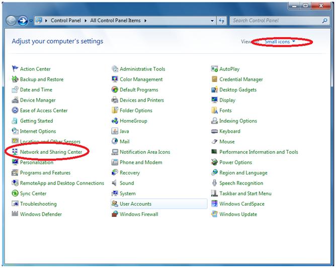 Once you have clicked on the “Control Panel” option you will be presented with the screen below. Make sure that it says “Small icons” in the top right hand corner of this screen. Now you need to left click on the “Network and Sharing Center” option.
