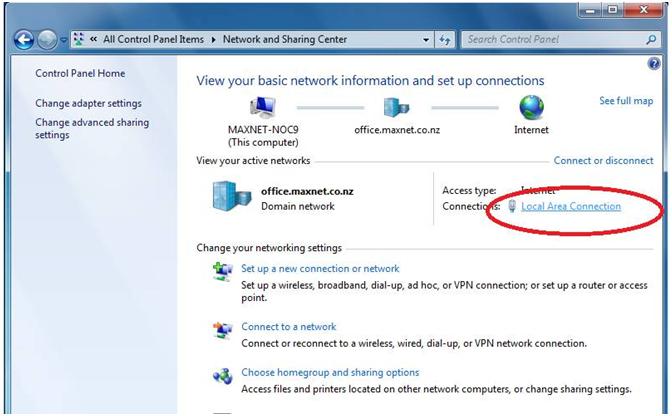 Once you have clicked on the “Network and Sharing Center” option you will be presented with this window below. In this window, left click on the “Local Area Connection” option