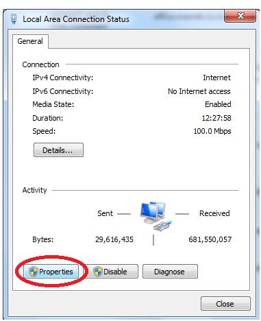 Once you have clicked on the “Local Area Connection” option you will be presented with the following window. In this window, left click on the “Properties” button.