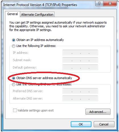 Once you have clicked the “Properties” button, you will be presented with this window. In this window we need to make sure that your settings are set to “Obtain DNS server address automatically”. If the dot is next to “Use the following DNS server addresses” then change this to “Obtain DNS server address automatically”. Once you have done this, left click on “OK” to close this window and left click “OK” in the other windows to close them as well.