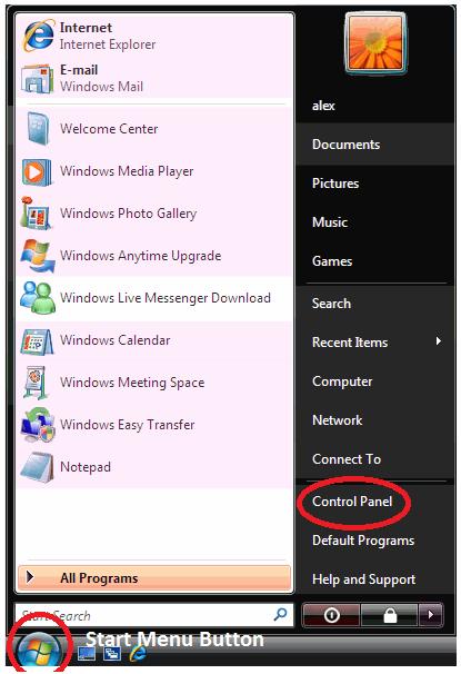 When you have turned on your Windows Vista machine and it has loaded up. Please left click on the “start” button(little circle with the 4 colours in it) down the bottom left hand corner. When you left click on the “start” circle it will bring up the “start menu” as shown below. In the “start menu”, left lick on the “ Control Panel” option on the right hand side.