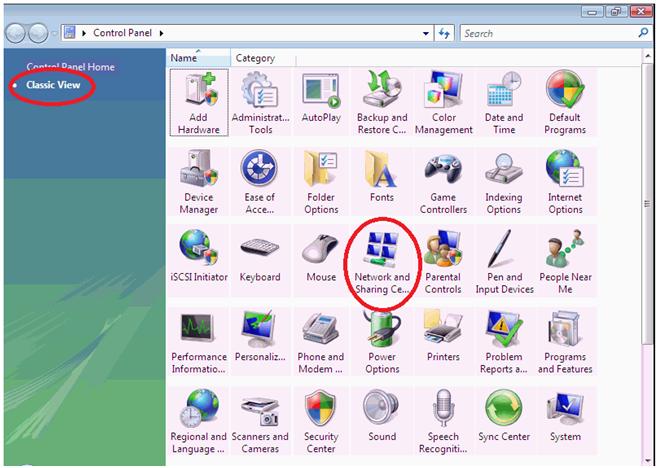 Once you have clicked on the “Control Panel” option you will be presented with the screen below. Make sure that it says “Classic View” in the top left hand corner of this screen. Now you need to left click on the “Network and Sharing Center” option.