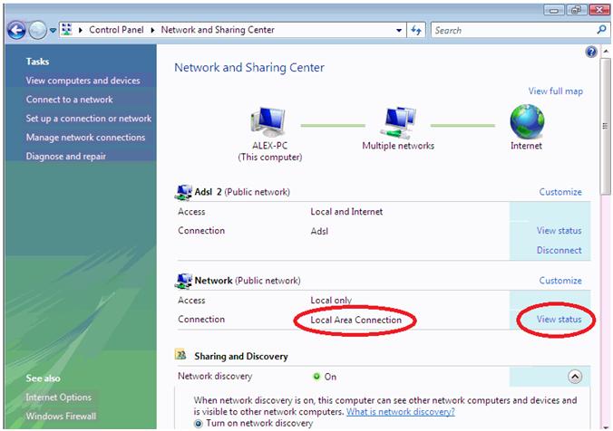 Once you have clicked on the “Network and Sharing Center” option you will be presented with this window below. In this window, left click on the “View Status” option next to your “Local Area Connection”