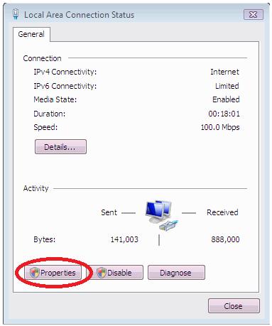 Once you have clicked on the “View Status” option you will be presented with the following window. In this window, left click on the “Properties” button.