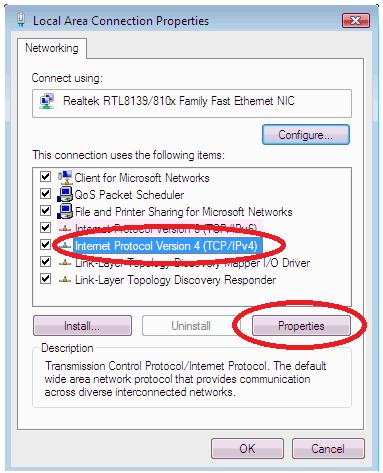 - Once you have clicked on the “Properties” button you will be presented by the following window. Left click on the “Internet Protocol Version 4(TCP/IPv4)” option then left click the “Properties” button.