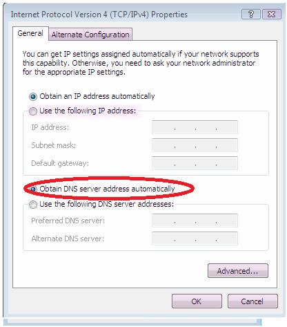 Once you have clicked the “Properties” button, you will be presented with this window. In this window we need to make sure that your settings are set to “Obtain DNS server address automatically”. If the dot is next to “Use the following DNS server addresses” then change this to “Obtain DNS server address automatically”. Once you have done this, left click on “OK” to close this window and then continue to close the other windows as well.