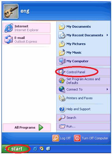 When you have turned on your Windows XP machine and it has loaded up. Please left click on the “start” buttongreen button with start on it) down the bottom left hand corner. When you left click on the “start” circle it will bring up the “start menu” as shown below. In the “start menu”, left lick on the “ Control Panel” option on the right hand side.