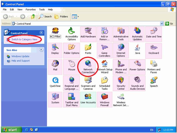 Once you have clicked on the “Control Panel” option you will be presented with the screen below. Make sure that it says “Switch to Category View” in the top left hand corner of this screen as it means that we are in “Classic View” which is where we want to be. Now you need to left click on the “Network Connections” option.