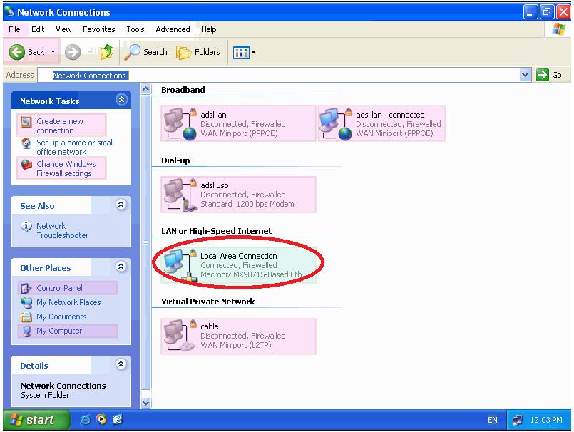 Once you have clicked on the “Network Connections” option you will be presented with this window below. In this window, double click on the “Local Area Connection” or right click this and click “Open” in the menu.