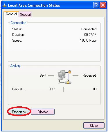 Once you have double clicked on the “Local Area Connection” option you will be presented with the following window. In this window, left click on the “Properties” button.