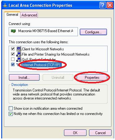 Once you have clicked on the “Properties” button you will be presented by the following window. Left click on the “Internet Protocol (TCP/IP)” option then left click the “Properties” button.